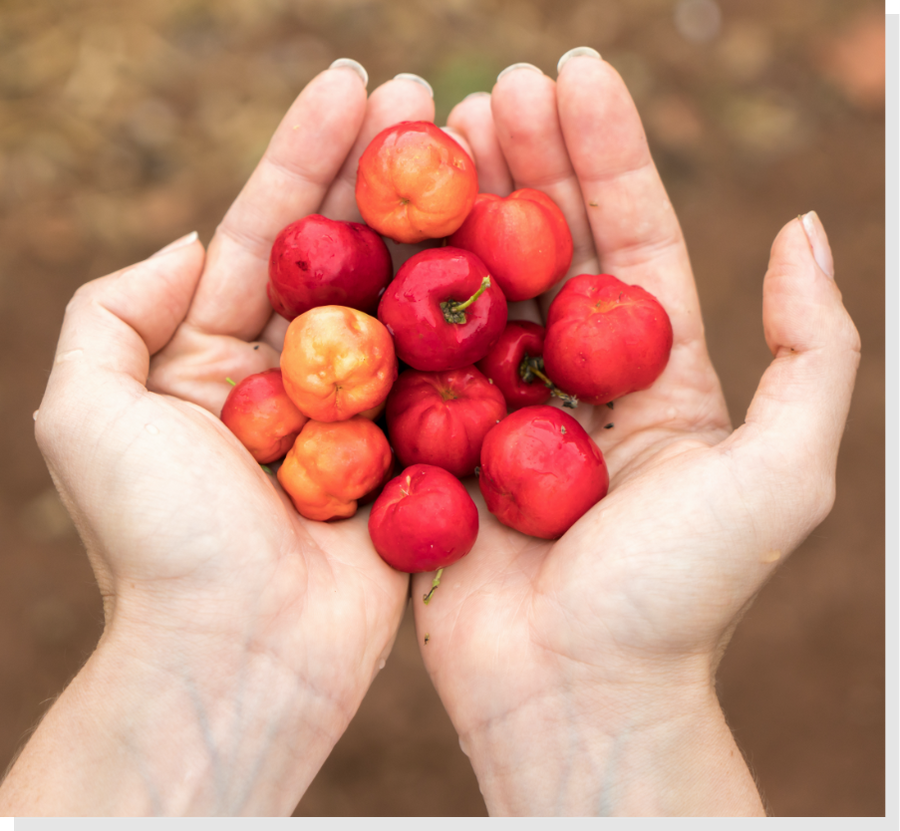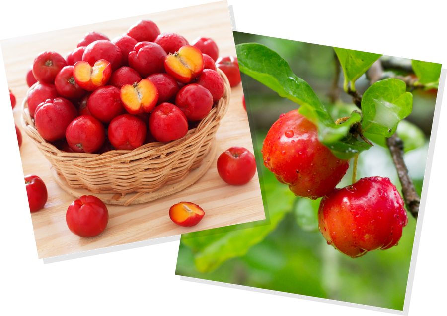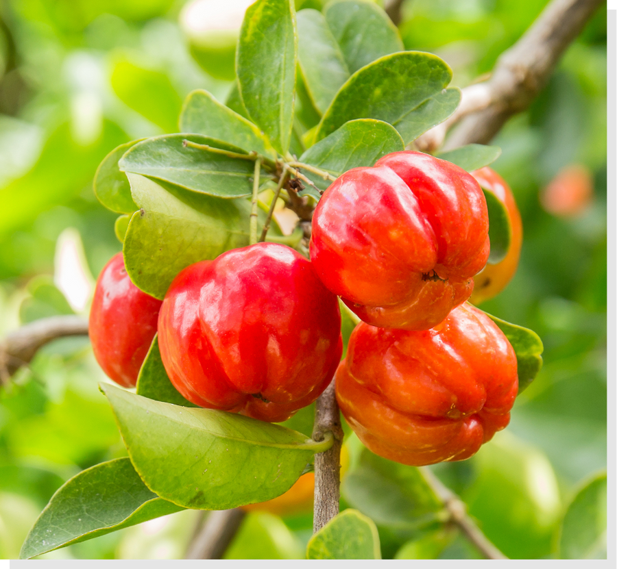 Acerola (pronounced ah-sir-oh-la) is a small, cherry-like fruit that grows on large, dense shrubs throughout the tropics of South and Central America, as well as the Caribbean. Often called the “Amazon cherry” or “Barbados cherry”, its taste ranges from tart to semi-sweet with the Brazilian varieties being noted as the richest and sweetest. Each serving of acerola contains up to 30 times as much Vitamin C as an orange!